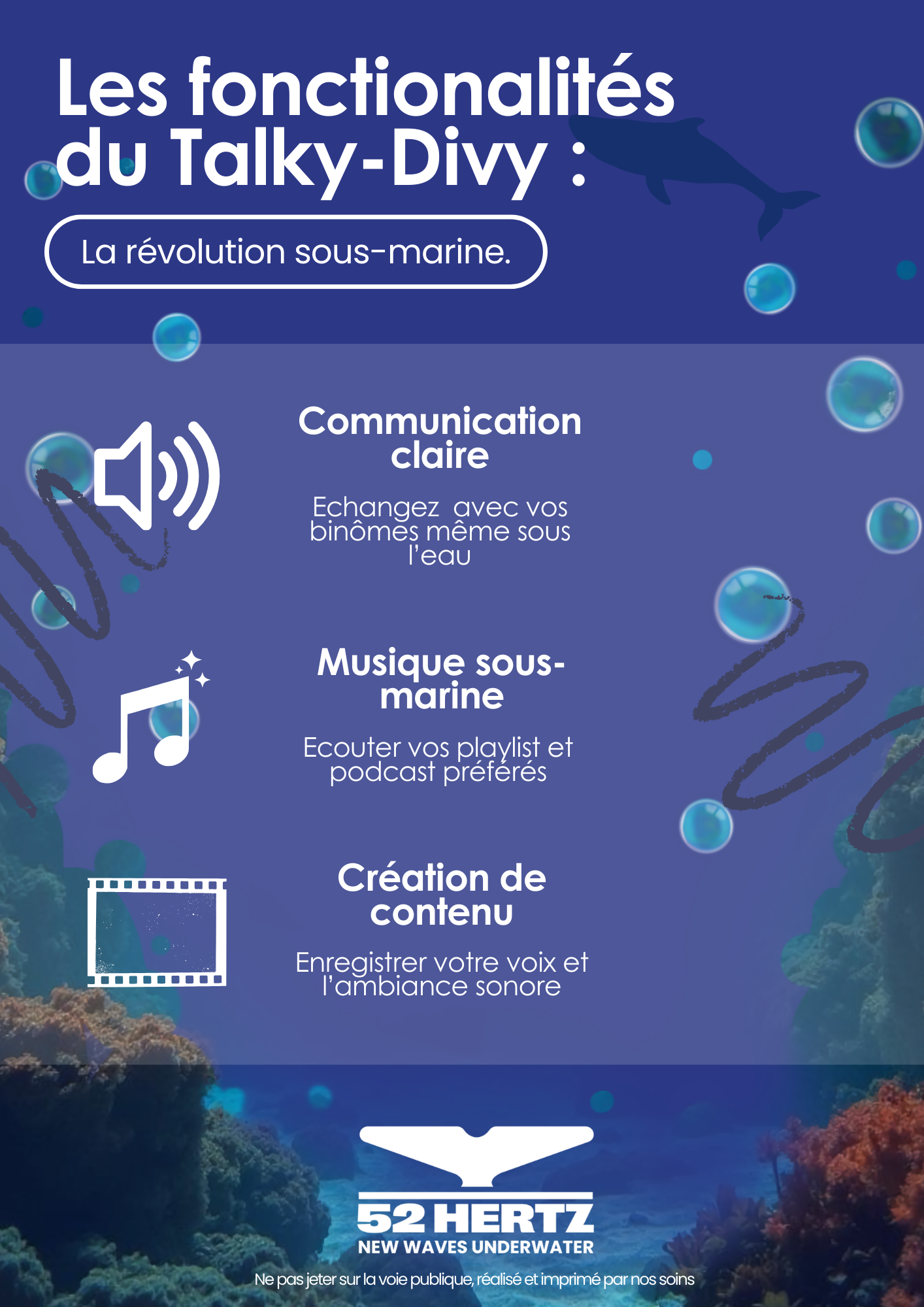Le cœur du sujet est de capitaliser sur la légitimité technique du Talky-Divy — déjà prouvée chez les militaires et les scientifiques — pour séduire le marché du grand public (B2C) via Instagram. La métaphore de la baleine de 52 Hertz prend ici tout son sens : il s'agit de briser l'isolement du plongeur en proposant une solution de communication vocale par conduction osseuse, intégrée directement à l'équipement habituel.